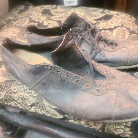 Vintage Baseball Cleats Shoes Pitchers Leather Black Size? These things are cool. I really don't have much info on them. Ive owned them for years. I haven't even dusted them off. Yup. Original dust....