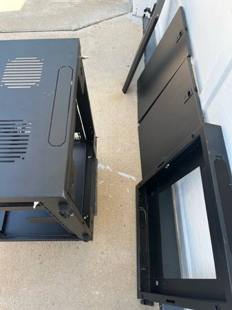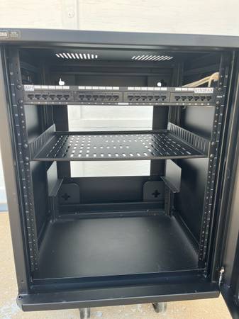 Used Strong WM Series network cabinet. Sides and front come off as shown and whole cabinet can be removed from back. All seen in photos. It does have keys for all sections needed, back, front and sides can be locked. Front door is glass. Also has a previous patch panel in place CAT5e still reusable and can be rewired to CAT6